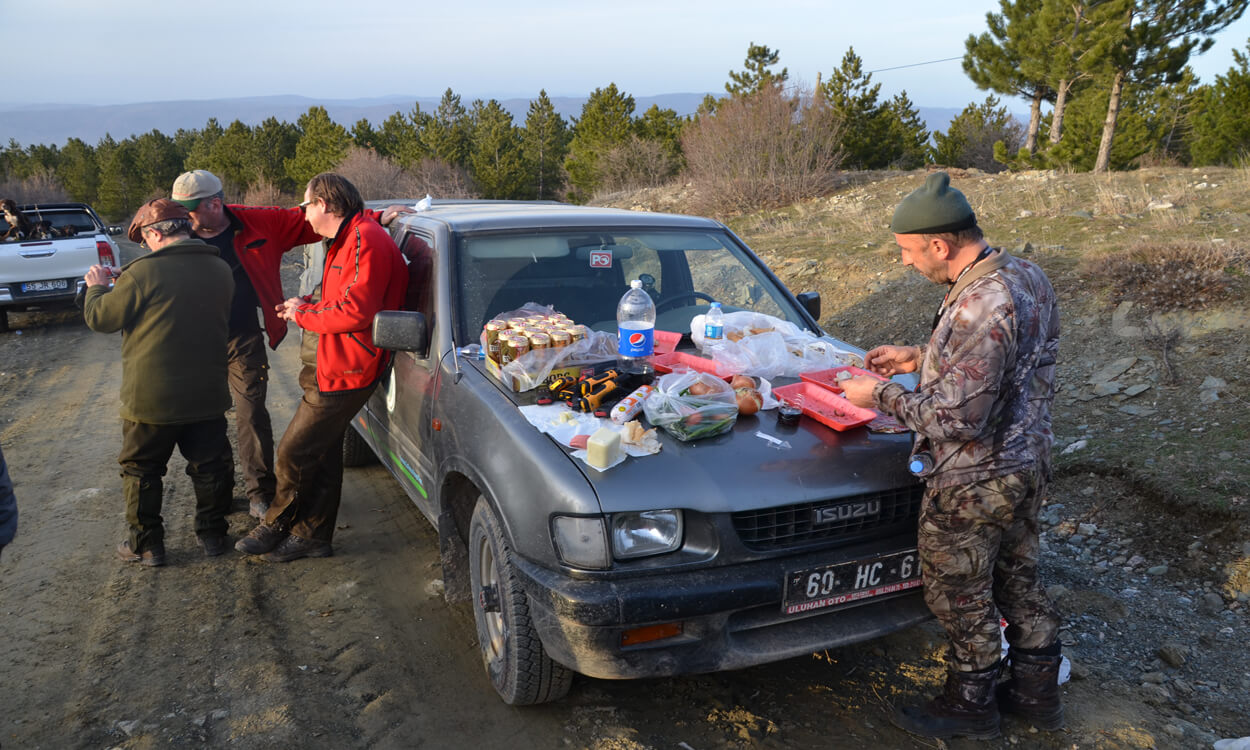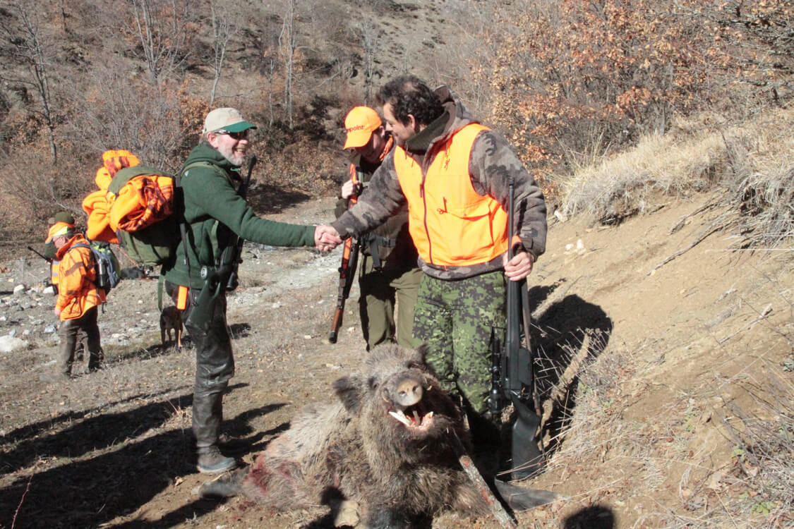 Weiter oben fallen plötzlich viele Böllerschüsse, Hundegeläut und aufgerecktes Rufen ist zu hören, doch wer mag schon sagen wo genau sich dies abspielen mag. Wieder das Pfeifen und Knacken des Lautsprechers und dann ertönt über das Tal:“ Allahauuuuuuuuuuuu_ akbaaaaaaaaaaaaaaar“ Und während das langgezogene „ Allahu“ noch über die Berghänge echot, schwappt es schwarz über den mir gegenüberliegenden Bergrücken. Sauen, Sauen, Sauen, endlos Sauen…… Das Adrenalin übermannt mich.